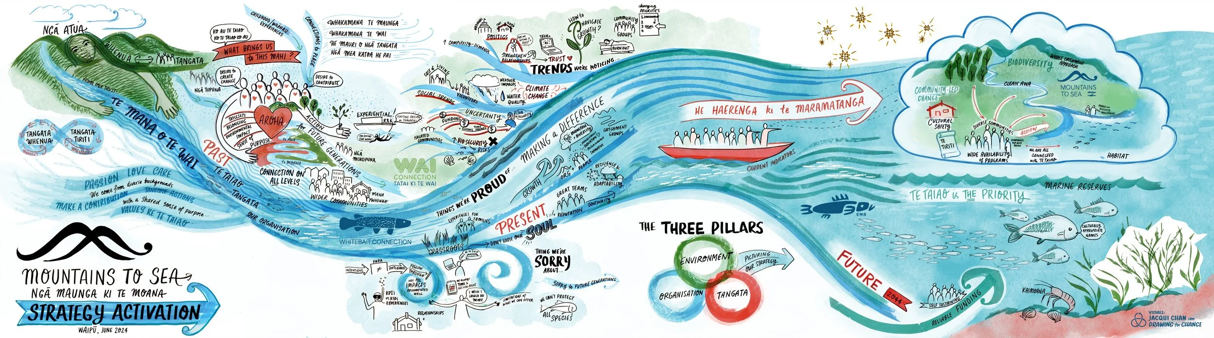 I was invited by the Mountains to Sea Conservation Trust to scribe at a strategy wānanga facilitated by Miranda Cassidy-O’Connell (from the Centre for Social Impact).