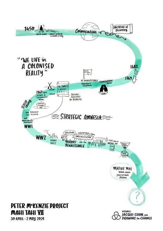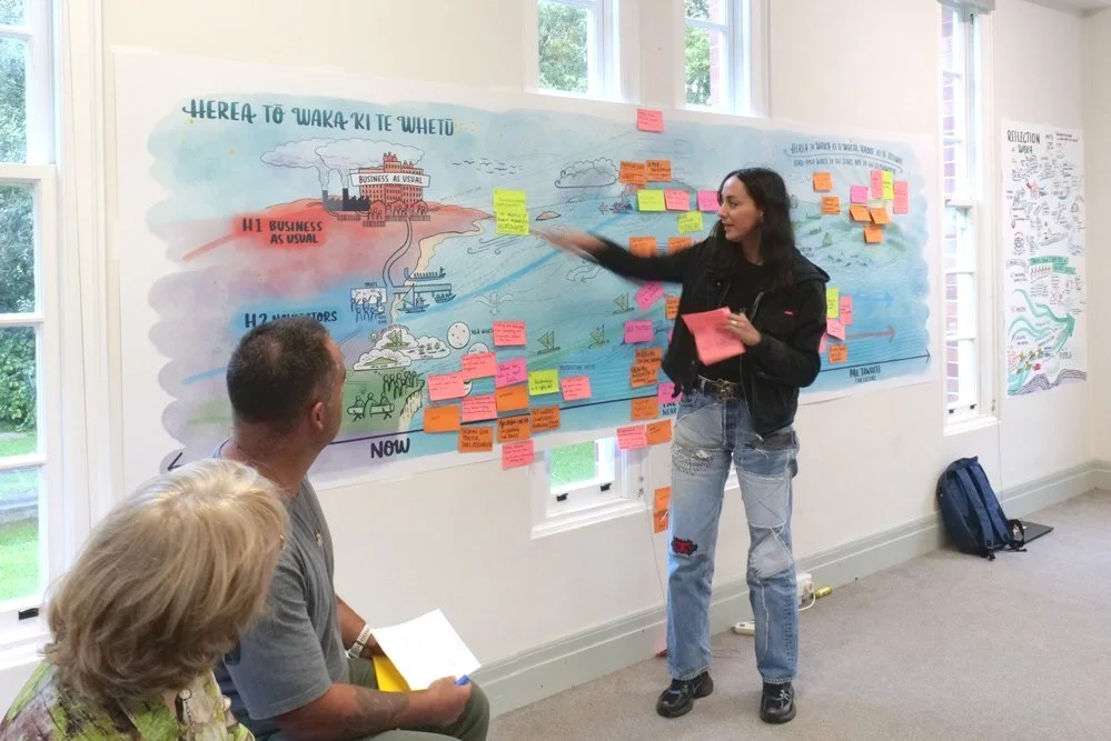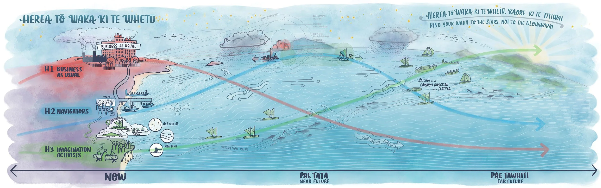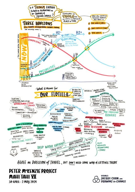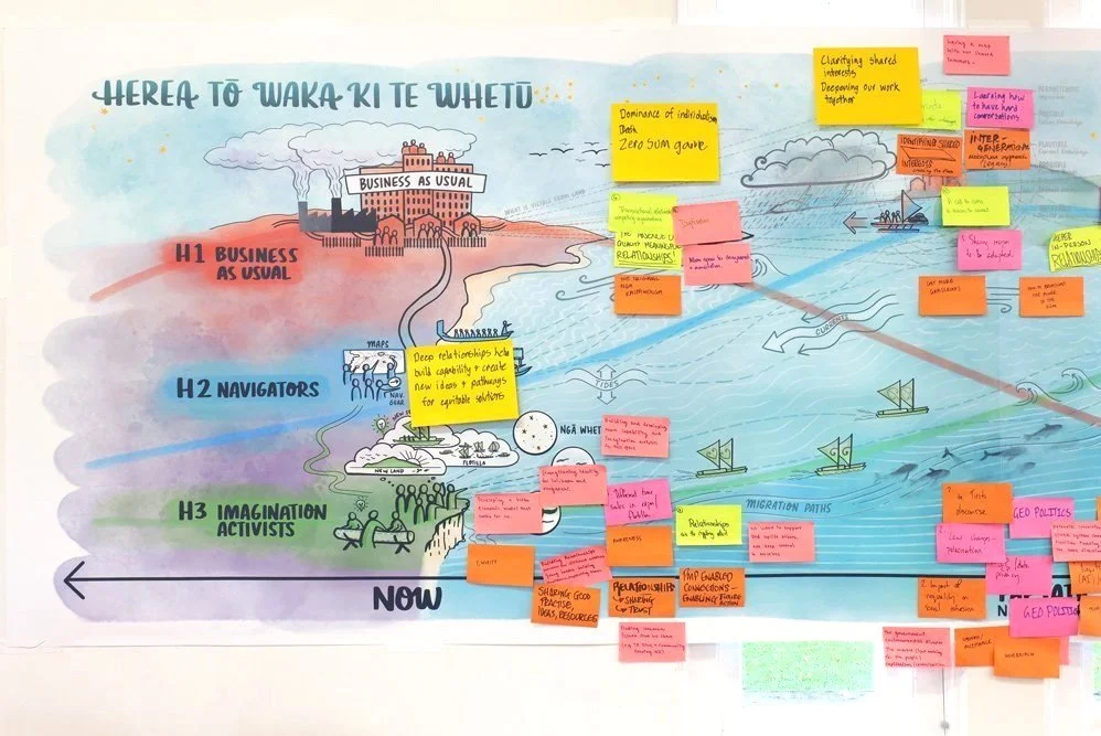 Here is the wall drawing I created to interweave the Three Horizons model with PMP’s flotilla/moana navigation metaphor, along with the whakatauki gifted by our talented facilitator Trent Hohaia. We used this in the space as 3.5m wall print onto which the rōpū added their whakaaro.
