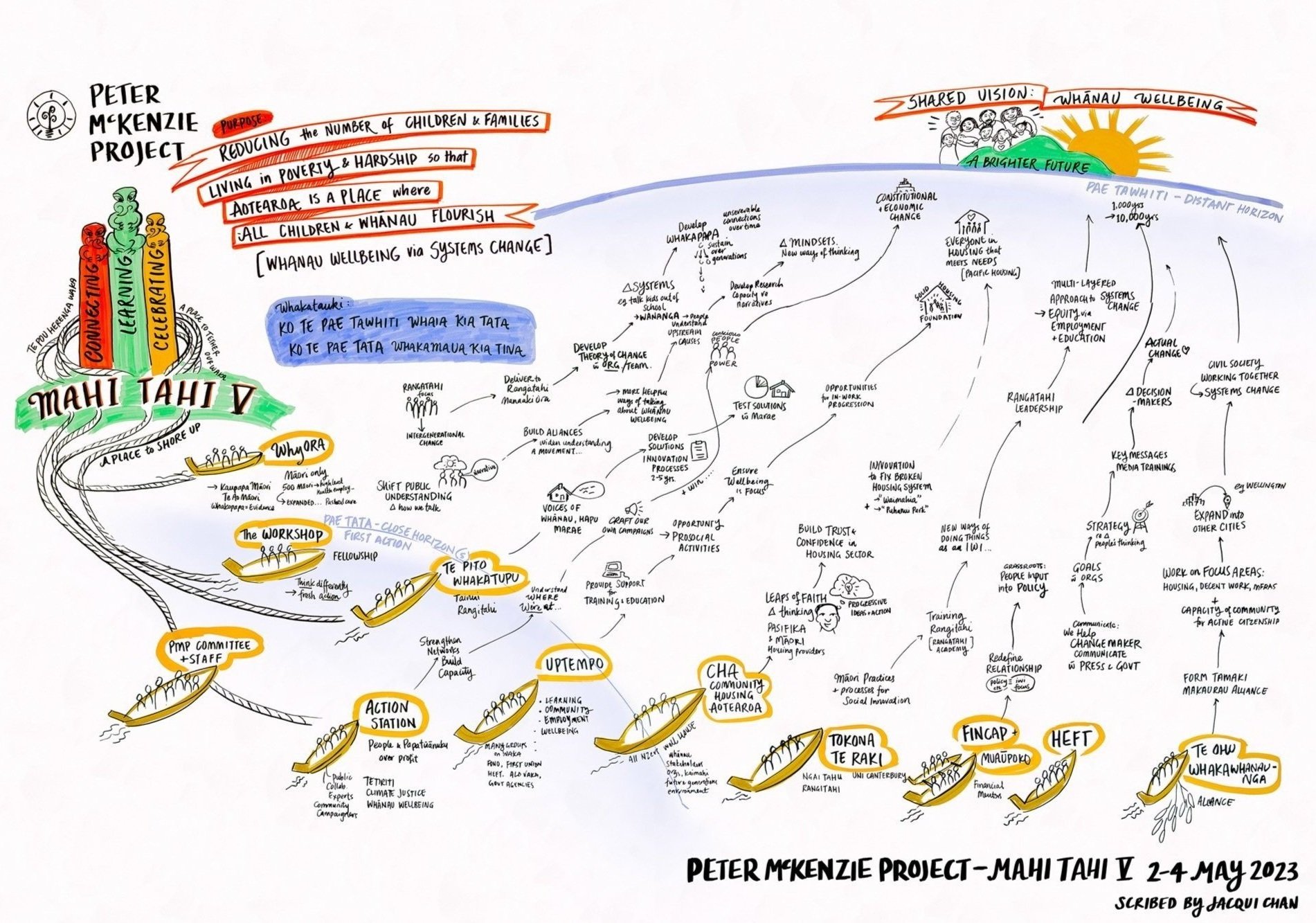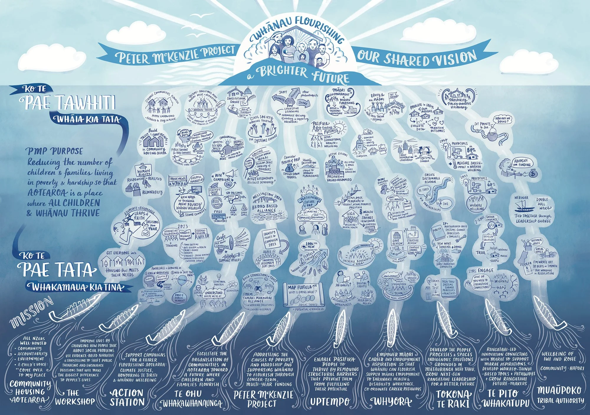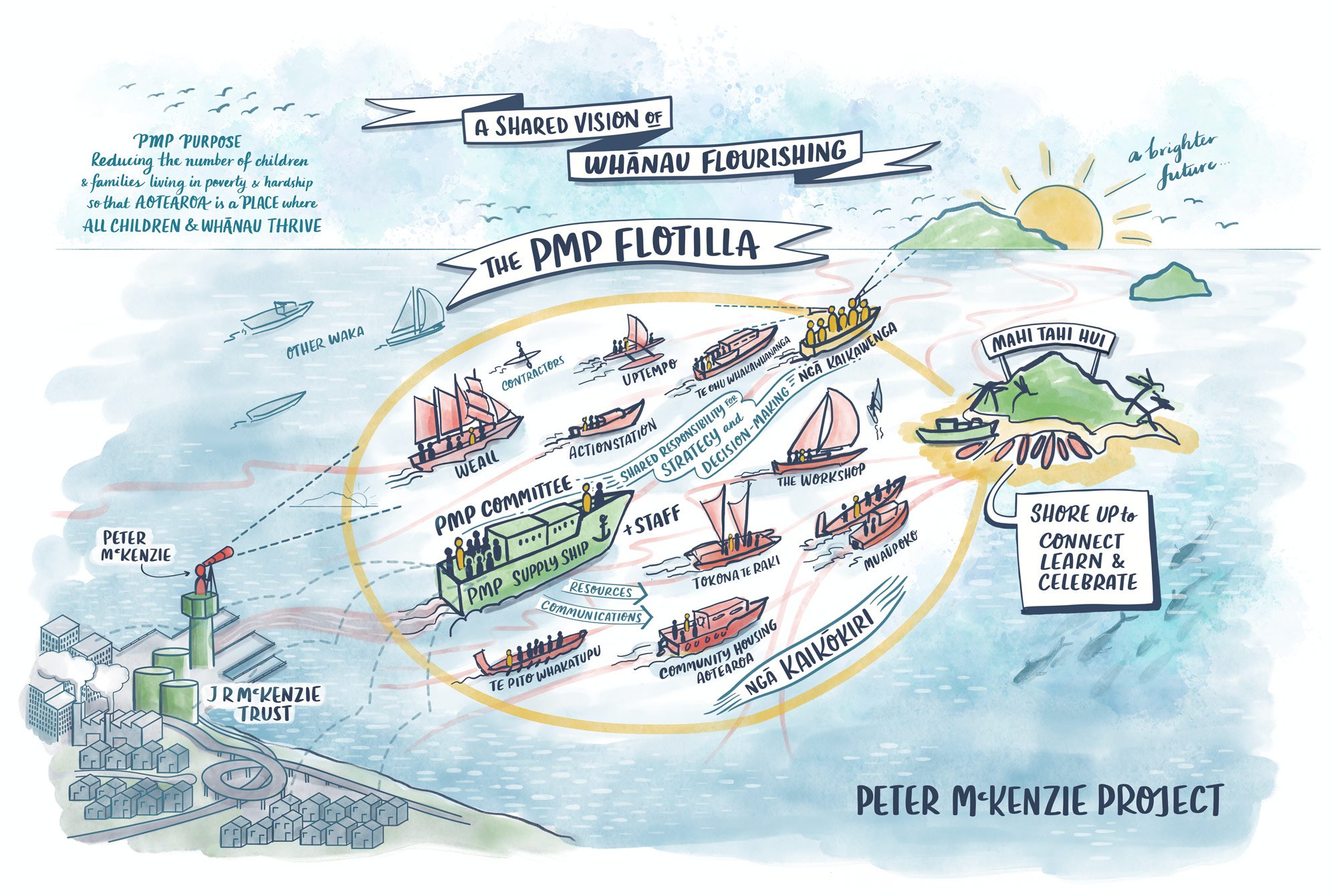 The project has a rich visual metaphor of a flotilla of waka sailing in a shared direction. The flotilla ‘tethers up’ every six months for a Mahi Tahi hui, to connect and learn from one another in order to super‑charge the impact the flotilla as a whole.