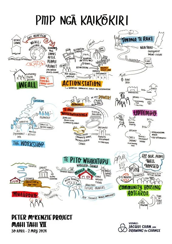 In this project the drawings form a durable visual record of the collective, and used to help on-board new people into the kaupapa.