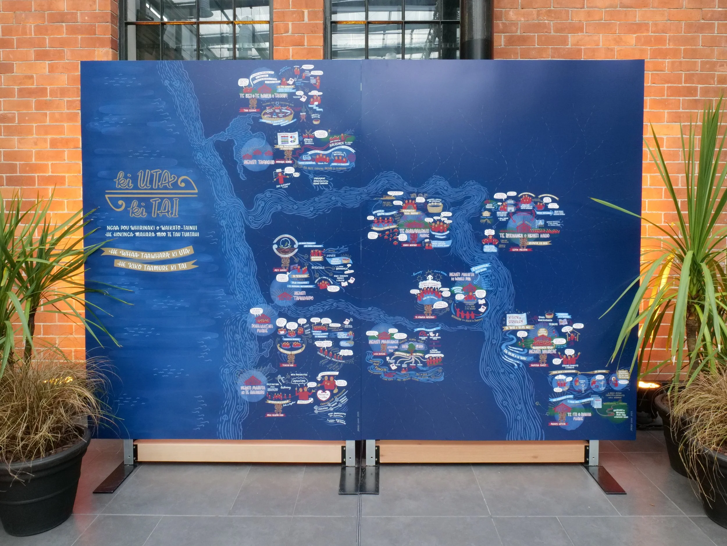 My mahi was to listen to these unique stories and share their impact. Initial zoom-based graphic recordings were reworked into final illustrations that were printed as a book, as well as a large-scale wall drawing for their Pō Whakanui celebration.